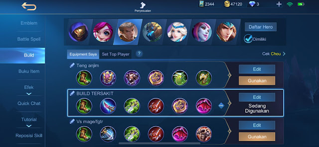 Karena Chou memiliki damage yang tinggi saya sangat merekomendasikan untuk menggunakan emblem Assassin High and Dry, untuk custom emblem-nya: